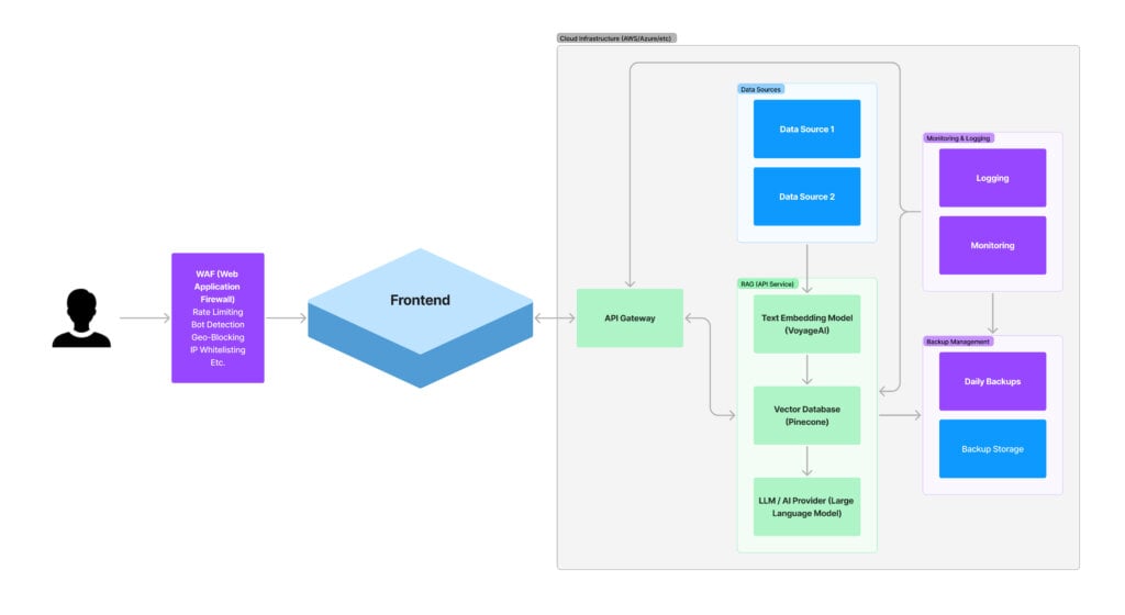 APIゲートウェイ、テキスト埋め込みモデル、ベクトルDB、拡張性の高いインフラ、セキュリティ対策(ボット検知・レート制限・IP制限)など、最先端技術で実装しました。